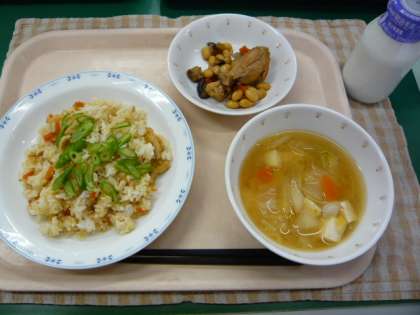 給食では、栄養いっぱいの豆をたくさん取り入れるようにしています。今日の給食の、「大豆と手羽のやわらか煮」にも大豆を使いました。クイズです。今日の給食には、そのままの大豆だけでなく、大豆から作られたものもいくつか使っています。さて、大豆から作られたものをいくつ使っているでしょうか?