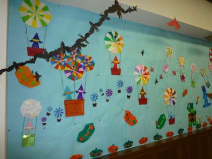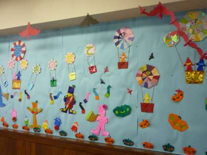 でも、本当はランチルーム・・・きれいなお部屋でおいしい給食を頂くのが目的で作られました。ですから、毎年可愛らしく折り紙で飾ってくれています。夢を乗せての気球のまわりにハロウィンの飾りが加わってとってもきれいです。