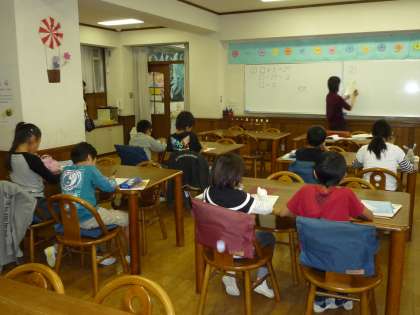 用賀小学校にはあいているお部屋が一つもありません。中でもランチルームは大忙しです。ある時はふれあい広場の折り紙教室、またある時は町の集会所、そして4年生の小人数算数学習の教室と大活躍です。