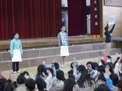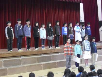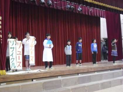 3/5 委員会発表集会 公開日 2014/03/05 更新日 2014/03/05 委員会・クラブ活動 今日の集会は環境委員会の発表でした。環境委員会の子どもたちは日頃から用賀小学校の子どもたちが環境に関心をもち、自分たちでできることに取り組むことができるように働きかけをしています。 今日の発表でも劇やクイズを通して、ごみの問題を分かりやすく提起したり、3つのRの大切さを伝えたりしていました。 学校ではこれからも子どもたちから環境について考える活動を大切にしていきます。