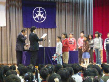 雨天のため、体育館で修了式を行いました。本当は、卒業式のための会場設営ができあがっていましたので、校庭で行いたいところですが仕方ありません。ただ、普段見慣れない紅白幕や演台が設置され、かえって皆の気持ちが引き締まったようにも感じました。