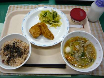 今日の給食は、お祝い献立です。1年の最後の給食ということで、みなさんの進級・卒業をお祝いして、お赤飯を炊きました。