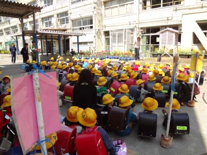 1年生の学校生活がスタート 公開日 2014/04/09 更新日 2014/04/09 今日のできごと 今日は教室で連絡帳の使い方、返事の仕方など学校生活の送り方を学習しました。トイレの使い方も学習しました。トイレの使い方は、実際にトイレに連れて行って使い方を確認しました。また、集団下校も始まりました。正門にコース別に整列。教員や学校主事、支援員等、大勢で見守っています。