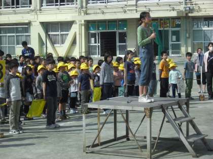 用賀小学校ではすでに集団登校を始めていますが、今日の発会式では校長先生や6年生の代表児童、校外安全委員会の委員長の方の話を聞き、全校で改めて安全について確認しました。