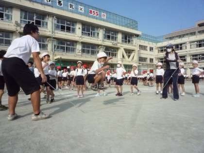 今日は待ちに待った長縄大会です。校長先生と朝の挨拶をした後、それぞれの練習の成果を競い合います。ほかの学級と競うのではなく、自己記録更新を目指すのです。どの学級も真剣に取り組んでいます。
