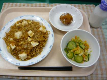 麻婆豆腐焼きそばに使っている豆腐には、体をつくってくれるたんぱく質や、骨や歯をつよくしてくれるカルシウムがたくさん入っています。残さず食べましょう。