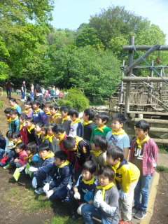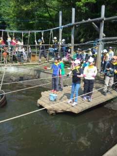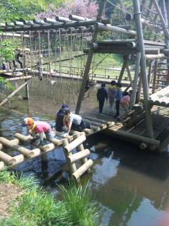 遠足4年生1 公開日 2014/04/24 更新日 2014/04/25 校長室より 4年生の遠足は「フィールドアスレチックつくし野コース」です。予定通りに到着し、前半はグループ行動です。ロープを握りしめ池の上を、バランスよく渡っています。グループで声を掛け合って楽しんでいます。