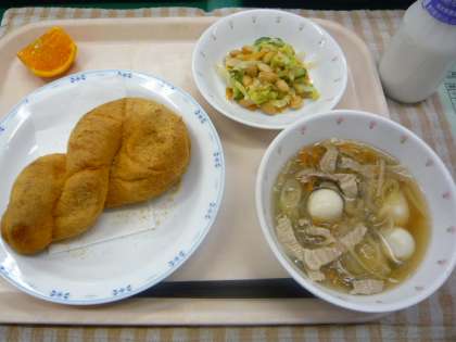 今日の給食は、「あげパン」です。そこでクイズです。あげパンにまぶしてある「きなこ」は、何から作られているでしょうか?