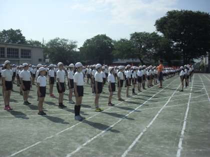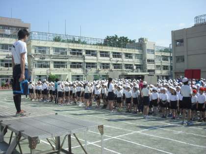 大型連休が終わり、子供たちは元気に登校しました。今日は水曜日ということで体育朝会をしました。前回の体育朝会は雨のため体育館での実施でしたが、今日は校庭で全員がそろうことができました。