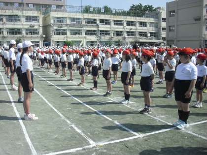 赤白に分かれて整列。そして体操の隊形に移動してラジオ体操。このように全員でそろって練習することで子供たちの気持ちにまとまりができ、運動会に向けての気持ちも高まっていきます。