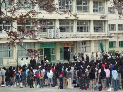 平成20年度第1学期の始業式を実施いたしました。雨が心配されましたが、青空がのぞく好天に恵まれ1年生をのぞいた2〜6年生が整列しましたが、そのすばやさにびっくりです。転出の先生・主事さん方、転入の先生・主事さん方の紹介から、担任発表まで、盛りだくさんの始業式です。