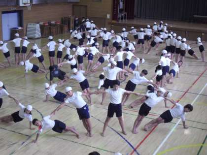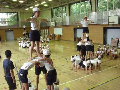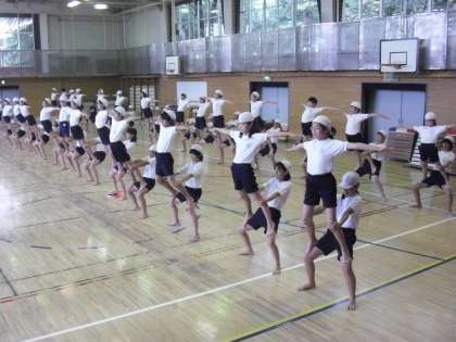 5/21 6年運動会練習 公開日 2014/05/21 更新日 2014/05/21 今日のできごと 今日は朝からあいにくの雨模様で、校庭での練習は全くできず、どの学年も体育館での練習となりました。 体育館は校庭に比べ狭いスペースですが、6年生は曲に合わせて組体操の練習をしっかりとすることができました。1つ1つの技を丁寧に確認しながら、その態度は真剣そのものでした。とても緊張感のある練習に6年生の本気さが現れていました。