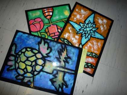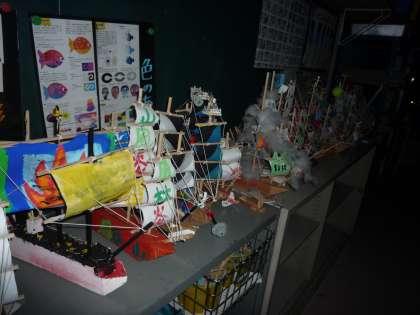 10/29 芸術の秋・展覧会に向けて・・・ 公開日 2009/10/29 更新日 2009/10/29 校長室より 1年生が版画をしているのかな・・・?と思って教室に入ってみると、大きな画用紙にローラーを転がして楽しんでいました。小さな切り紙を乗せるとローラーにくっついて模様になります。展覧会につかうのかな・・・? 夜の図工室はちょっと気味が悪いのですが、作品をのぞいてみました。たくさんの帆船が停泊しています。とってもきれいなステンドグラス状の作品・・・展覧会に向かって動き始めました。