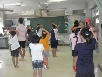 今日はグループに分かれて基本の動作を身に付ける練習を繰り返し行いました。どの子も真剣な態度でした。中学生も来て、6年生と共に下級生に踊り方を教えてくれました。