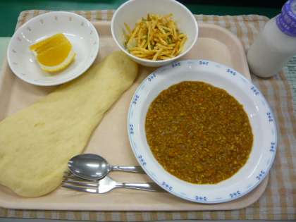 6/5 本日の給食 公開日 2014/06/05 更新日 2014/06/05 給食 〜今日の献立〜 ナン 牛乳 キーマカレー じゃがいものハニ—サラダ くだもの(河内晩柑) 〜給食メモ〜 今日のカレーは、「キーマカレー」です。そこでクイズです。キーマカレーの「キーマ」はインドの言葉で、何という意味でしょうか? 1.ひき肉 2.たまねぎ 3.大豆 今日も、残さず食べましょう。 ※クイズのこたえは、「食材がとれたところ…」の最後にのせています。 食材がとれたところ・・・ 閉じる 豚ひき肉…青森県 じゃがいも…長崎県 にんにく…青森県 たまねぎ…愛知県 セロリ—…長野県 にんじん…徳島県 しょうが…高知県 アスパラガス…山形県 キャベツ…愛知県 りんご…青森県 河内晩柑…愛媛県 クイズのこたえは、1の「ひき肉」です。キーマカレーには、ひき肉やみじん切りにした野菜を使います。ひき肉には体を作ってくれる「たんぱく質」、野菜にはおなかの中をきれいにしてくれる「食物繊維」がたくさん入っています。