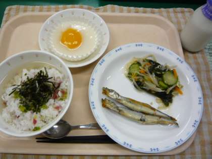 今日の給食は、「梅茶漬け」です。そこで今日は、梅茶漬けに使った「梅干し」のクイズを出したいと思います。梅干しのすっぱさのもと「クエン酸」には、どんなはたらきがあるでしょうか?