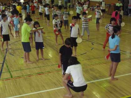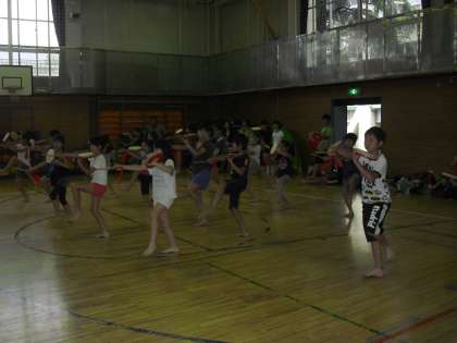 6/7 エイサー練習 公開日 2014/06/07 更新日 2014/06/07 特色ある活動・取り組み エイサーの第2回目の練習。全員が体育館に集い、先生方の指導のもと、基本の動きを身に付けるために、繰り返し何度も何度も練習していました。 練習では経験のある6年生が下級生のアドバイスをしたり、舞台に上がって見本を見せたりしています。このように、学年を越えて子どもたちがかかわり合いながら1つのチームをしてまとまりをもつことがこのエイサーの大切な目的です。