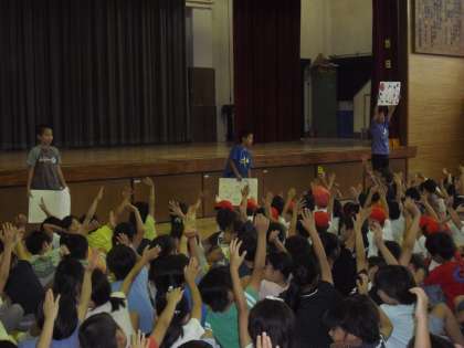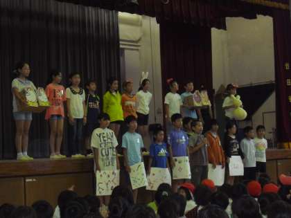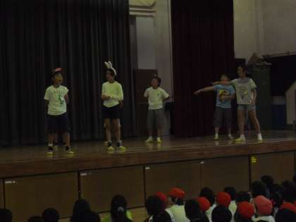 今日は毎日動物のお世話をしている飼育委員会の発表でした。学校には今うさぎのミルクと4羽のチャボがいて、飼育委員会の子どもたちがえさやりやそうじなどのお世話をしています。