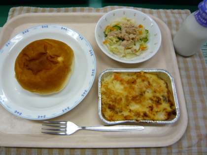 今日の給食は、「マカロニグラタン」です。そこで今日は、マカロニグラタンに使った「マカロニ」のクイズを出したいと思います。マカロニは、何から作られているでしょうか?