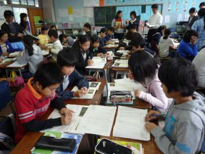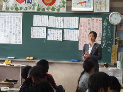 題材は、『人類よ、宇宙人になれ』という、説明文です。今日はその中の第3段落、太陽が死ねば、地球も死ぬの段落の要旨を考える学習です。一人ひとりが自分なりに要旨をまとめた後、グループで考えあって一つの意見にまとめて発表しました。実習生は緊張ぎみでしたが、子どもたちの学習態度がとても素晴らしく、鋭い視点での発表内容でした。