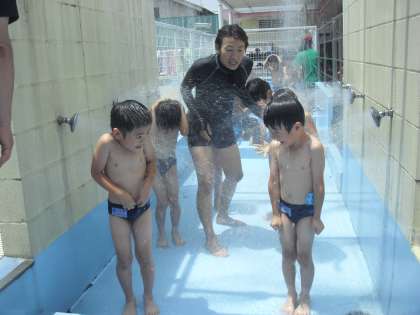 初めてのプールですので、当然ですがすべてのことが初めて。シャワーも初めてで水の冷たさに少しばかり興奮気味でしたが、体をしっかりと止めて、シャワーを浴びることができました。