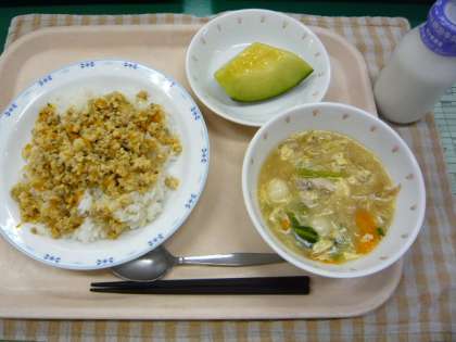 6/20 本日の給食 公開日 2014/06/21 更新日 2014/06/21 給食 〜今日の献立〜 ふわふわそぼろ丼 牛乳 白玉スープ くだもの(メロン) 〜給食メモ〜 今日の給食は、「ふわふわそぼろ丼」です。そこでクイズです。「ふわふわそぼろ丼」に入っているのは、次のうちのどれでしょうか? 1.パン 2.高野豆腐 3.お麩 今日も、残さず食べましょう。 ※クイズのこたえは、「食材がとれたところ…」の最後にのせています。 食材がとれたところ・・・ 閉じる 米…埼玉県 鶏ひき肉…宮崎県 鶏肉…岩手県、宮崎県 鶏卵…青森県 こまつな…東京都(江戸川区) しょうが…高知県 たまねぎ…愛知県 にんじん…千葉県 もやし…栃木県 長ねぎ…茨城県 メロン…茨城県 クイズのこたえは、3の「高野豆腐」です。高野豆腐は、豆腐を凍らせて、乾燥させたものです。今日のそぼろ丼は、高野豆腐を入れて、ふわふわの食感にしました。高野豆腐には、体を作ってくれるたんぱく質、骨を強くしてくれるカルシウムがたくさん入っています。