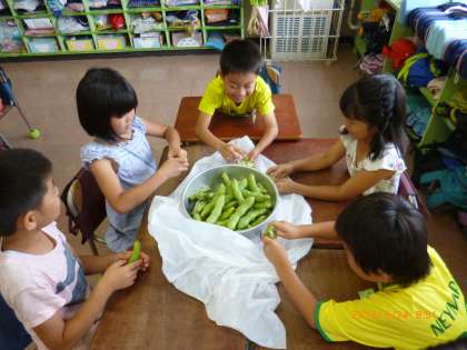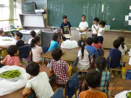 今日のそら豆は、2年生と給食委員さんがさやむきをしてくれました。そこで今日は、「そら豆」のクイズを出したいと思います。そら豆の名前の由来は、次のうちのどれでしょうか?