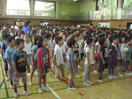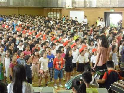 深水先生の指導のもと、みんなで言葉を合わせて、気持ちよく歌うことをめあてに歌いました。体育館には梅雨空を吹き飛ばす子どもたちの元気な歌声が響き渡りました。