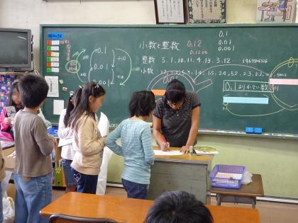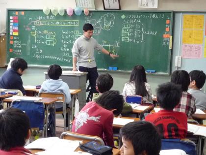 用賀小学校では、3年生からの算数で少人数の習熟度(コース)べつの学習をしていますが、3年生のはじめは、ティームティーチングからのスタートです。