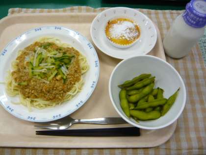7/3 本日の給食 公開日 2014/07/03 更新日 2014/07/03 給食 〜今日の献立〜 ジャージャー麺 牛乳 えだまめ かぼちゃのケーキ 〜給食メモ〜 今日の給食には、今が旬の「枝豆」を出しました。そこでクイズです。枝豆は、成長すると名前がかわります。何という名前になるでしょうか? 1.そら豆 2.うずら豆 3.大豆 ※クイズのこたえは、「食材がとれたところ…」の最後にのせています。 食材がとれたところ・・・ 閉じる 豚ひき肉…茨城県 鶏卵…青森県 にんにく…青森県 しょうが…高知県 たまねぎ…愛知県 にんじん…千葉県 きゅうり…埼玉県 もやし…群馬県 えだまめ…群馬県 かぼちゃ…静岡県 クイズのこたえは、3の「大豆」です。成長すると、名前がかわるだけでなく、栄養素もかわります。枝豆にはビタミン、大豆にはたんぱく質がたくさん入っています。食べものには、それぞれよいところがあります。すききらいぜず、残さず食べましょう。