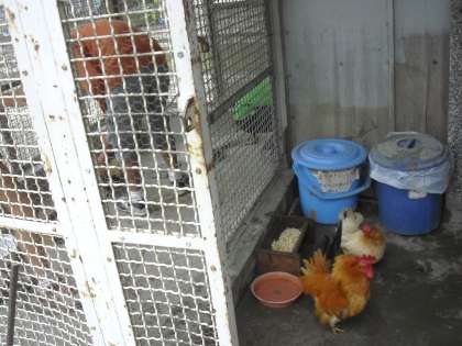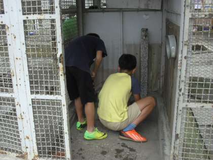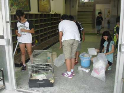 これらの動物たちの日々のお世話をしているのが飼育委員会の5,6年生の子どもたちです。今日は毎月1回の委員会活動の日なので、うさぎのかごとチャボ小屋の大掃除をします。ふんやえさの食べこぼしある中ですが、子どもたちは黙々と作業をし、かごも小屋もたいへんきれいになりました。そして、きれいになったところに動物たちを戻してあげました。