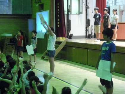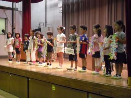 まずは集会委員会の子どもたちによる七夕にちなんだ劇とクイズ。内容がよく工夫されていて、会場には子どもたちの笑い声があふれ、笑いあり、知識ありすばらしい出し物でした。