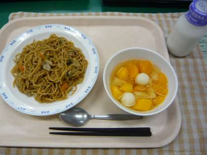 給食の焼きそばは、野菜をたくさん使っていて栄養満点です。残さず食べましょう。