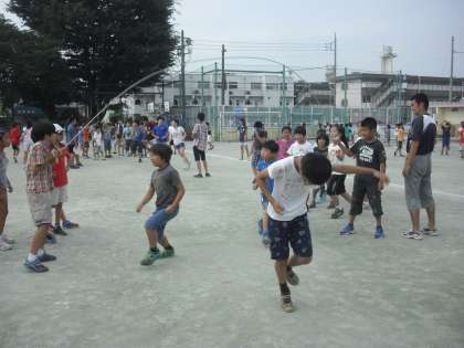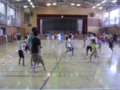 7/17 わくわくタイム 公開日 2014/07/17 更新日 2014/07/17 特色ある活動・取り組み 明日で1学期が終了。今朝は全校でわくわくタイムです。子どもたちは担任の先生や友達とクラス遊びをして楽しい時間を過ごしました。 体育館では1年3組と6年3組が手つなぎ鬼をしていました。1年生が入学以来、さまざまな交流をもってきた1年生と6年生。6年生は1年生のことを大切にし、1年生は6年生をとても信頼しています。自然な形で遊んでいる姿を見ると、心がほのぼのしてきます。
