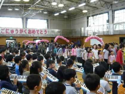 3校時目に体育館で1年生を迎える会がありました。2年生によるけんばんハーモニカの「こいぬのマーチ」の演奏にのせて、1年生と6年生が手をつないで入場しました。1年生はそのままステージの方に座りましたが、少し緊張した面もちでした。