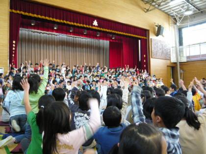 2年生から6年生までの「はじめの一歩」の歓迎の歌の次に、用賀小のクイズがありました。本当は、1年生に出題されているのに、上級生達は、歓迎する気持ちと優しい気持ちから、声を張り上げて1年生に答えを教えてあげていました。この頃には、1年生もすっかり安心した表情になっていました。