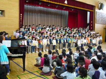 1年生だけで「どきどきの1ねんせい」を発表しました。かつて自分達も歌った2,3年生はいっしょに歌っていました。