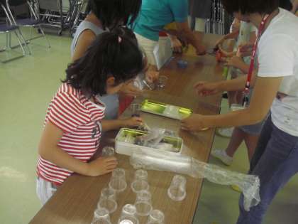 まず初めに、マラカス作り。透明のカップに小豆やビーズなどを入れて一人ひとり手作りのマラカスを作りました。これで準備はO・K!!