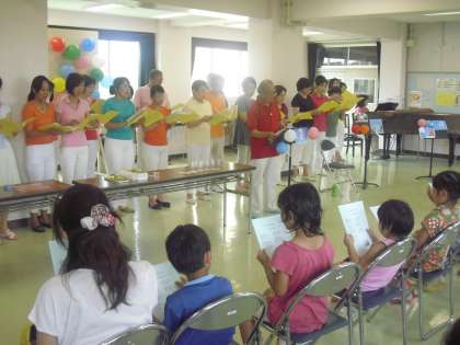 「Let It Go〜ありのままで」では、振りをつけて思いっきりなりきりました。「もののけ姫」ではマラカスの出番です。思い思いにリズムをとって速く振ったりゆったり振ったりして楽しみました。「いのちの名前」では、ラ・ラ・ラようがのみなさんがステキな歌声を聴かせてくれました。子どもたちはみんなうっとりしていました。