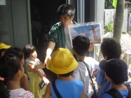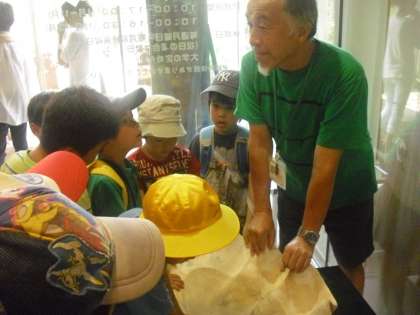 博物館では、最初に大きなシャコガイを見て、実際に触りました。「ざらざらしてる!」「重っ!」など子どもたちから思わず言葉が出ていました。ほかにもサメの歯やシーラカンス、屋久杉、とても厚い卵の殻の化石などを見せていただきました。
