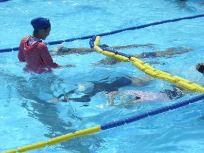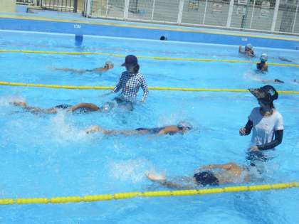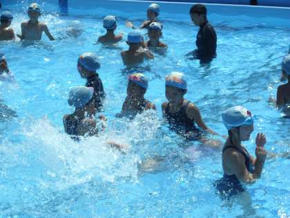 8/19 水泳教室 公開日 2014/08/19 更新日 2014/08/19 特色ある活動・取り組み 今日も強い日差しが照りつける暑い日ですが、3,4年生の子どもたちも大勢プールに来て、元気に泳いでいます。 楽しく水慣れをした後は泳力別練習。ビート板を使ってバタ足をしたり、コースロープの下をくぐってもぐりながら泳いだり、丁寧にクロールで泳いだりと、皆それぞれの練習を頑張っています。中には平泳ぎの練習をしている子もいます。 今日のプールも子どもたちの頑張りでとても活気づいています。
