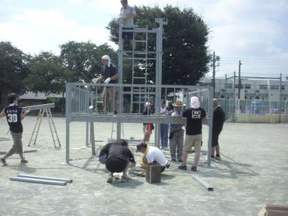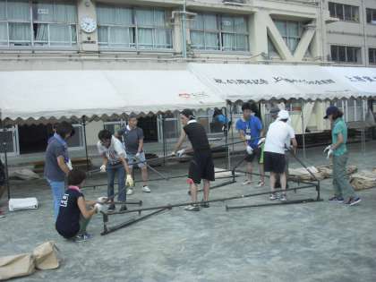 今日は朝早くから地域や保護者の皆様、そして私たち教員で前日準備を取り組んでいます。テント張りにやぐらの組み立て、照明の設置、机・いす出し等をたいへんな暑さの中、みんなで協力しながら作業をしました。