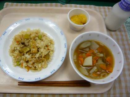 十五夜は、秋の収穫に感謝するお祭りで、里芋やお団子などをお供えして、月見をする風習があります。今日の給食には、「里芋」を使ったみそ汁、かぼちゃで黄色く色をつけて月に見立てた「月見団子」を出しました。お月見気分を味わってみてください。