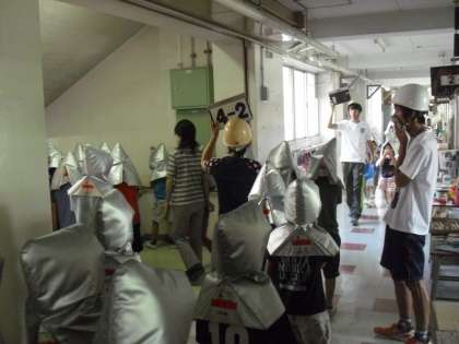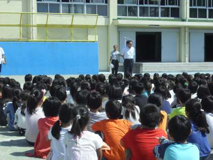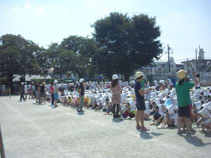 放送を受け、防災頭巾をかぶり、口にハンカチをあて、クラスごとに並んで校庭に避難をしました。学校では火災の時ハンカチが自分の命を守る大切なものと子どもたちに教えています。子どもたちは話をすることなく避難をし、これまでの学習の積み重ねが見られました。