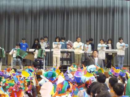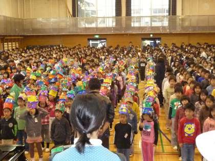 会場には、なんと1年生が、あのおしゃれな帽子をかぶって登場です。せっかく作ったお気に入りの帽子ですから・・・。