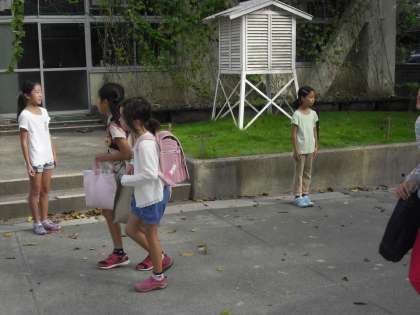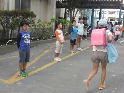台風の通過で1日休校となりましたが、台風一過の晴天の中、子どもたちが元気に登校してきました。あいさつ運動が行われ、門には4年生が立ち、登校してくる子どもたちにあいさつをし、子どもたちのあいさつの声が響き渡りました。