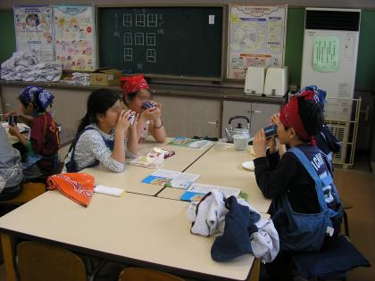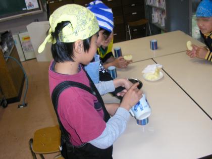 今日は、これから始まる調理実習に向けて、ガスの使い方とお湯の沸かし方を勉強しました。沸かしたお湯で玄米茶を入れて、包丁でりんごを切って、美味しくいただきました。明日は、遠足で豚汁を作ります。少しは役に立ったかな???