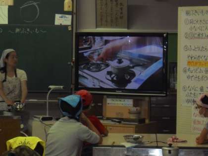 6年生が家庭科の学習でじゃがいもを使って調理実習をしました。包丁やガスコンロ等の器具を正しく安全に使うこと、正しい方法で調理することなどが学習のめあてです。子どもたちは班の友達とひとつひとつの作業を確認し合いながら調理をしていました。日景先生が大型テレビに実際の調理場面を映し出して、子どもたちにわかりやすく指導していました。
