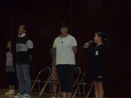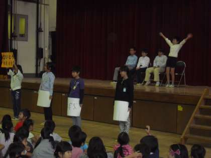 用賀小に長くいらっしゃる先生方に用賀小のよいところをインタビューしたり、児童が扮する歴代の校長先生が登場したりと、楽しい企画が盛りだくさんで、低学年でも楽しく学校を知ることができました。
