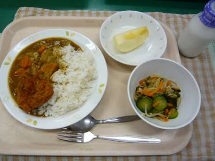 10/20 本日の給食 公開日 2014/10/21 更新日 2014/10/21 給食 〜今日の献立〜 カツカレー 牛乳 梅サラダ くだもの(りんご) 〜給食メモ〜 明日は、6年生の連合運動会です。そこで今日の給食は、応援の気持ちを込めて、「カツカレー」にしました。クイズです。今日のカツには、何のお肉を使ったでしょうか? 1.鶏肉 2.豚肉 3.牛肉 今日も、残さず食ましょう。 ※クイズのこたえは、「食材がとれたところ…」の最後にのせています。 食材がとれたところ・・・ 閉じる 米…埼玉県 鶏肉…岩手県、宮崎県 鶏卵…青森県 しょうが…東京都(八王子市) にんにく…青森県 たまねぎ…北海道 セロリ—…長野県 にんじん…北海道 きゅうり…群馬県 もやし…栃木県 りんご…長野県 クイズのこたえは、1の「鶏肉」です。鶏肉には、体をつくってくれるたんぱく質や、疲れをとってくれるビタミンがたくさん入っています。